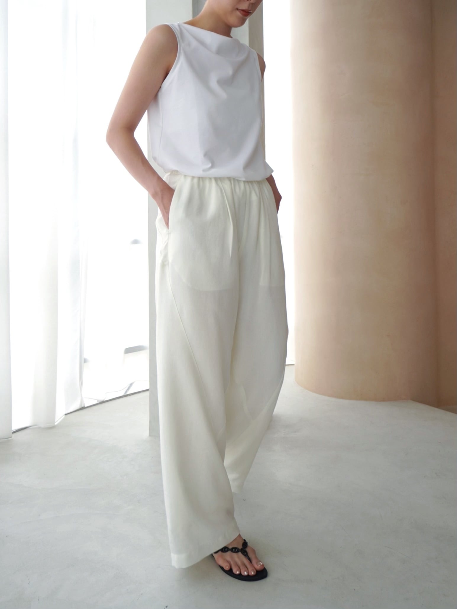 トリアセテートの仮撚りスラブ糸を使用し、麻のような糸節や麻かすを表現したナチュラルな風合いの、麻調素材です。ドライな質感とサラッとした軽い着心地で、素肌に纏っても心地よく、夏でも履きやすいです。