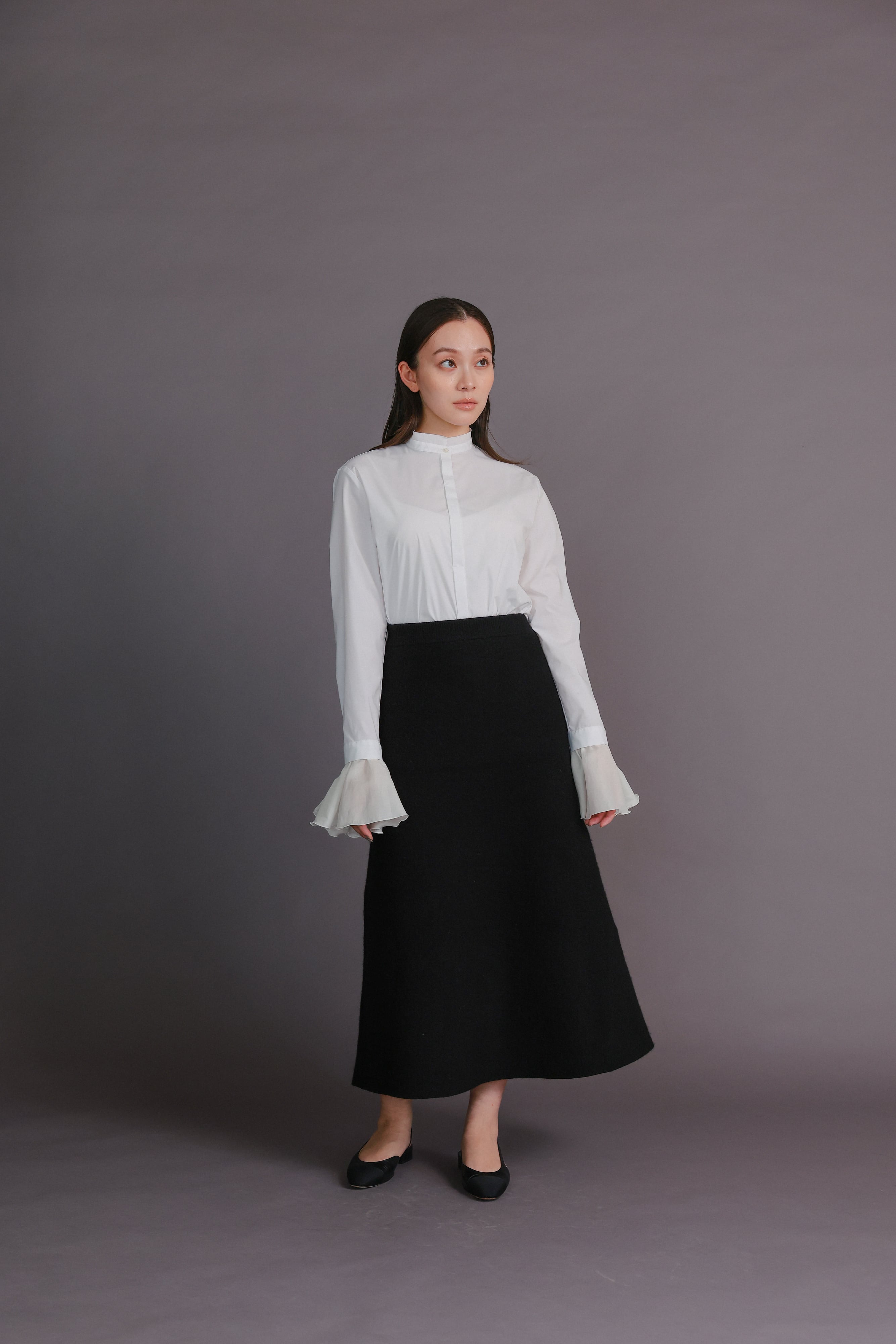 身体を締めつけず、自然に広がるAラインシルエット。すとんと落ちるラインが、構築的で洗練された印象を引き立てます。
