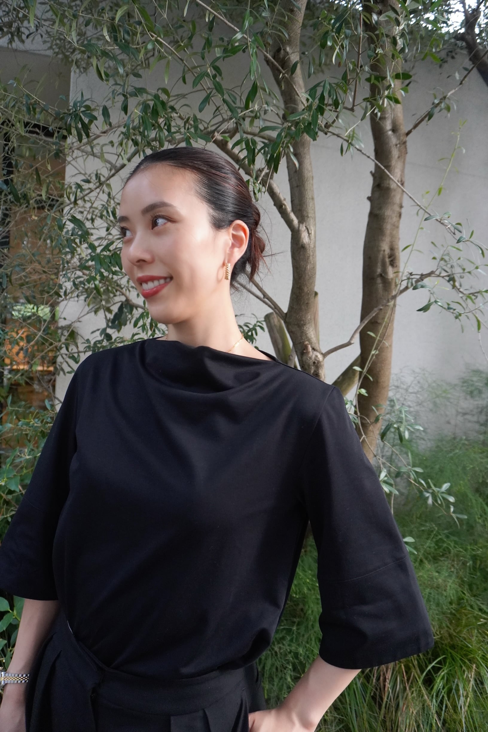 ご好評いただいているモックネックロングスリーブカットソー、そしてタンクトップタイプの〈DRAPE NECK TOP〉に続き、5分袖バージョンが仲間入りします。